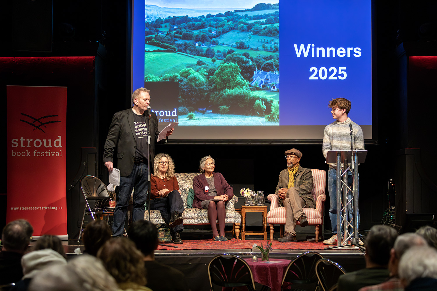 From left to right, judges: Adam Horowitz, Jane Bailey, Jamila Gavin, Ronnie McGrath, and winner of the 16-20 category, Jasper Sones. Photograph courtesy of Tammy Lynn.